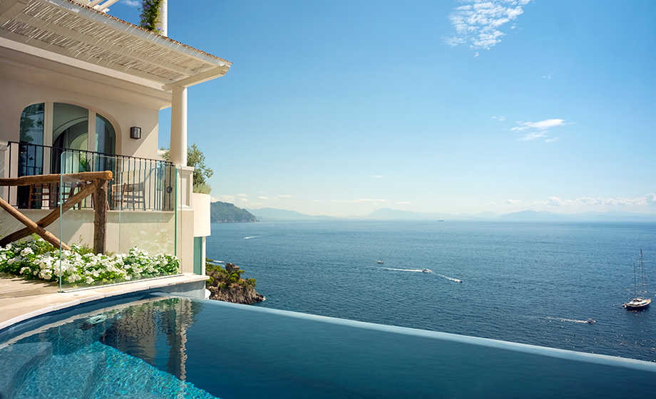 Spaziosa e raffinata, la nostra Junior Suite Vista Mare e Piscina offre un panorama tra i più suggestivi della Costiera Amalfitana, di cui godere immersi nell’acqua scintillante della piscina a sfioro o sdraiati comodamente sui lettini sotto il gazebo.