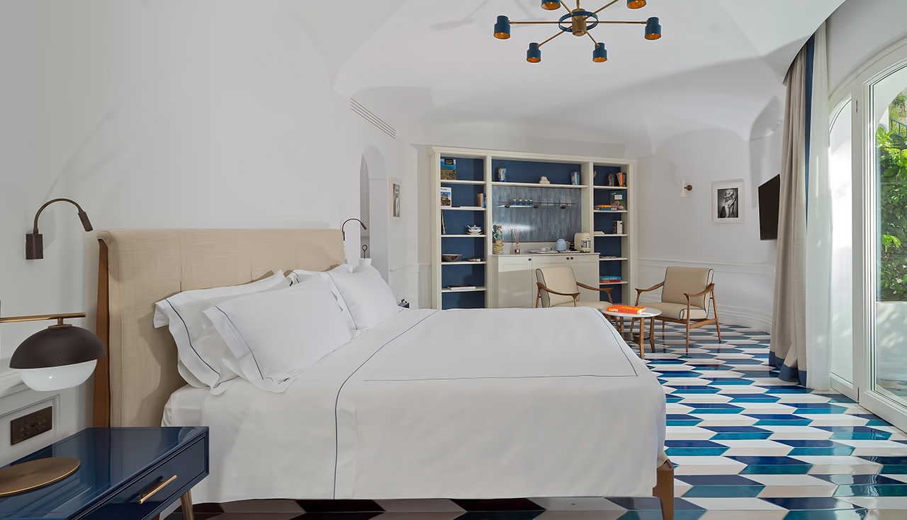 Rifinita con bagno in marmo italiano e pavimenti in ceramica fatti a mano, la nostra luminosa Junior suite vista mare e piscina racchiude l'essenza stessa della dolce vita. Caratterizzate da pavimenti in ceramica artigianali decorati a mano e un maestoso bagno in marmo, queste suite sono l’emblema del glamour italiano.